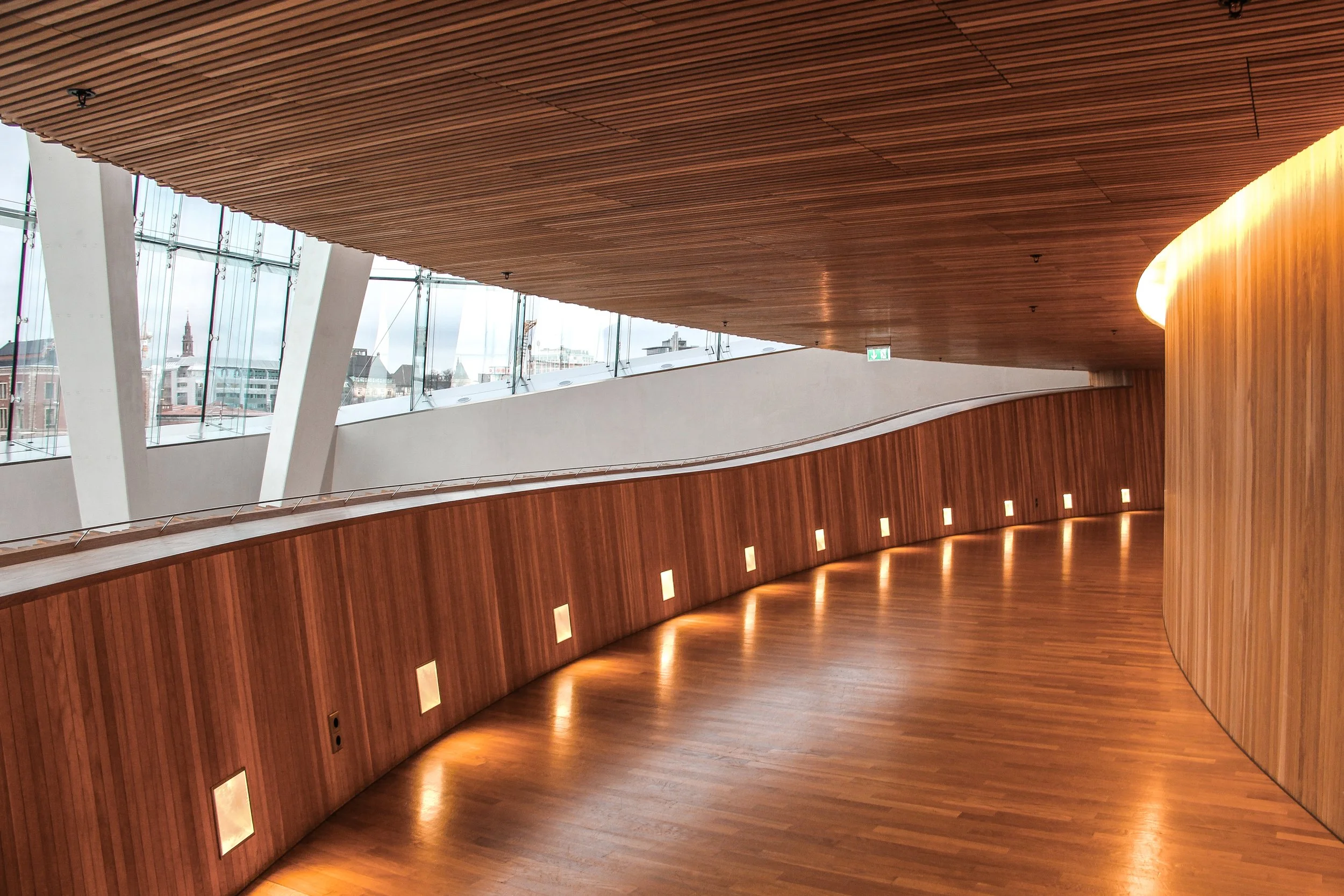 Piscine intérieure avec lignes de natation, décor en bois, et espaces de repos le long du mur.