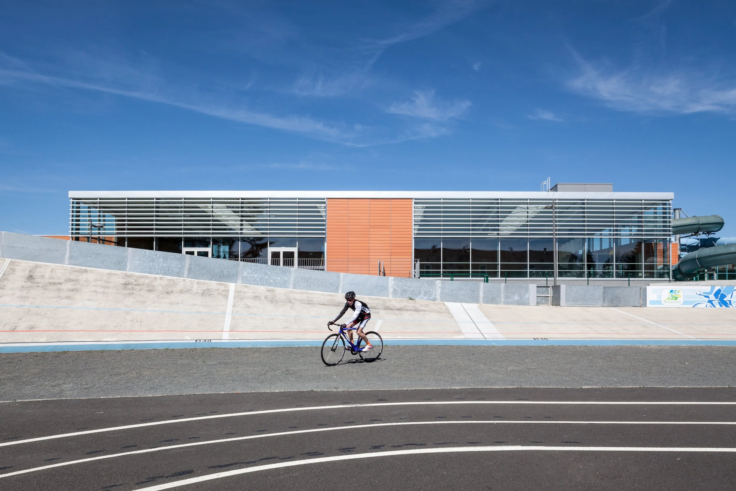 Un cycliste portant un casque et un gilet réfléchissant, montant une rampe d'escalier en béton devant un bâtiment moderne.