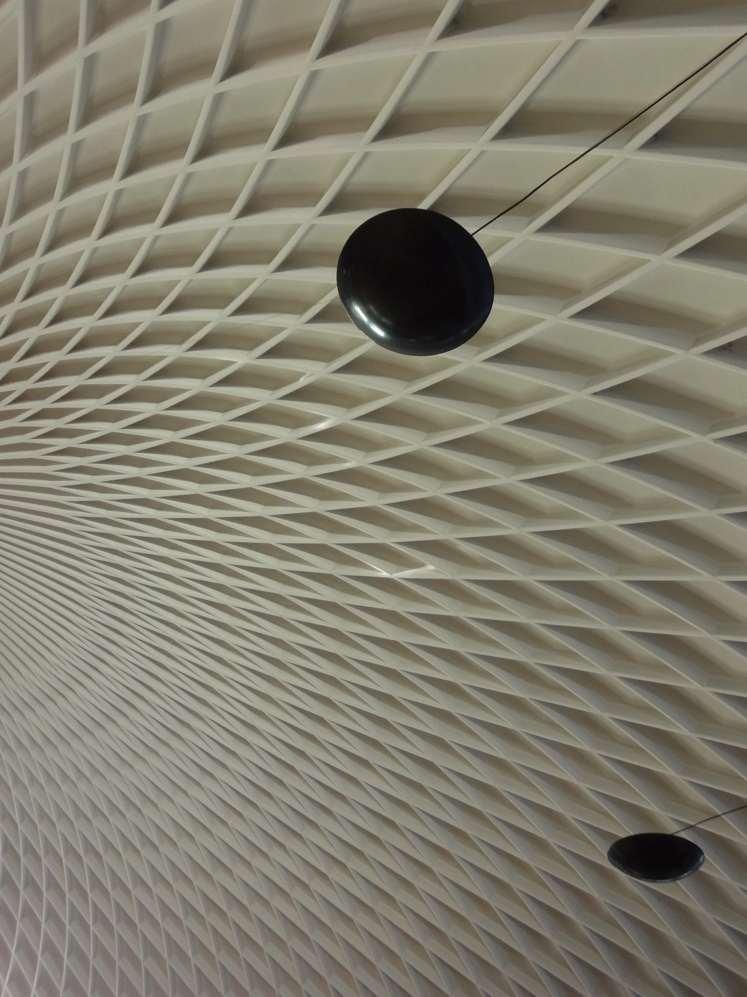 Vue d'un bâtiment moderne avec un grand porche, des colonnes, et un plafond en métal sculpté à Moscou. Il y a de la neige sur le sol.