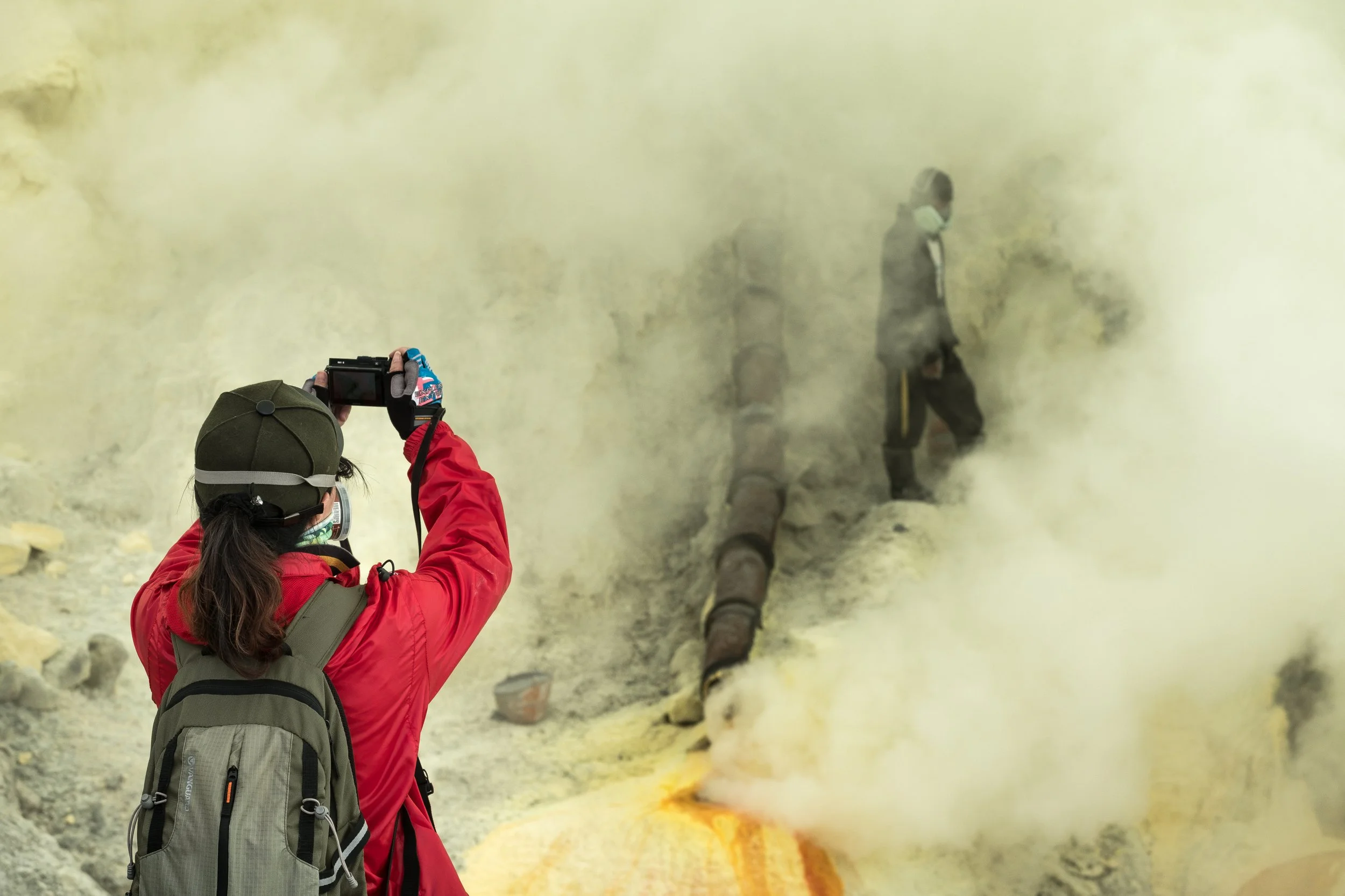 La mine du Kawah Ijen est connue pour ses conditions de travail dantesque et sa stupéfiante beauté. Un lac d’acide bleu turquoise jouxte le site d’extraction. Les pentes abruptes et ciselés du cratère s’érigent comme des remparts autour de cet endroit d’exception. Tout serait idyllique si un gaz toxique ne faisait pas partie de l’équation. Les nuages de soufre dans lesquels les mineurs évoluent sont extrêmement dangereux pour la santé. Sur leurs épaules, ils remontent pas à pas 80 kilos de soufre logés dans deux paniers en osier et revendent le fruit de leur labeur 6 centimes le kilo. Ce soufre sert à la fabrication de produits cosmétiques, d'allumettes, d'engrais et d'insecticides ou encore au raffinage du sucre.